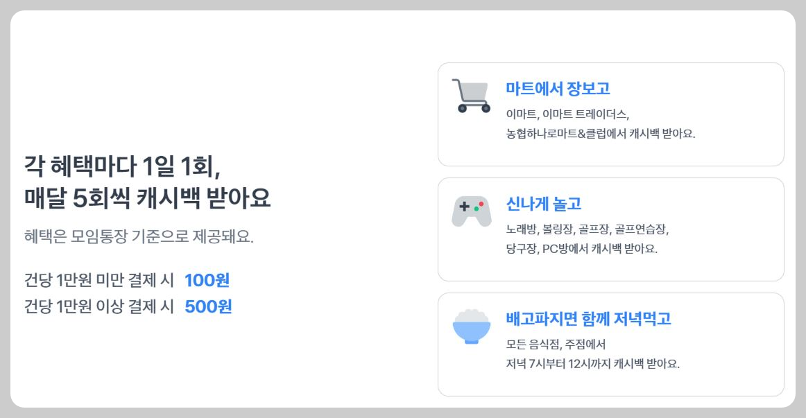 | 이용한도 | 카드당 일 100만원, 카드당 월 2,000만원 모임통장당 일 1,000만원 |
